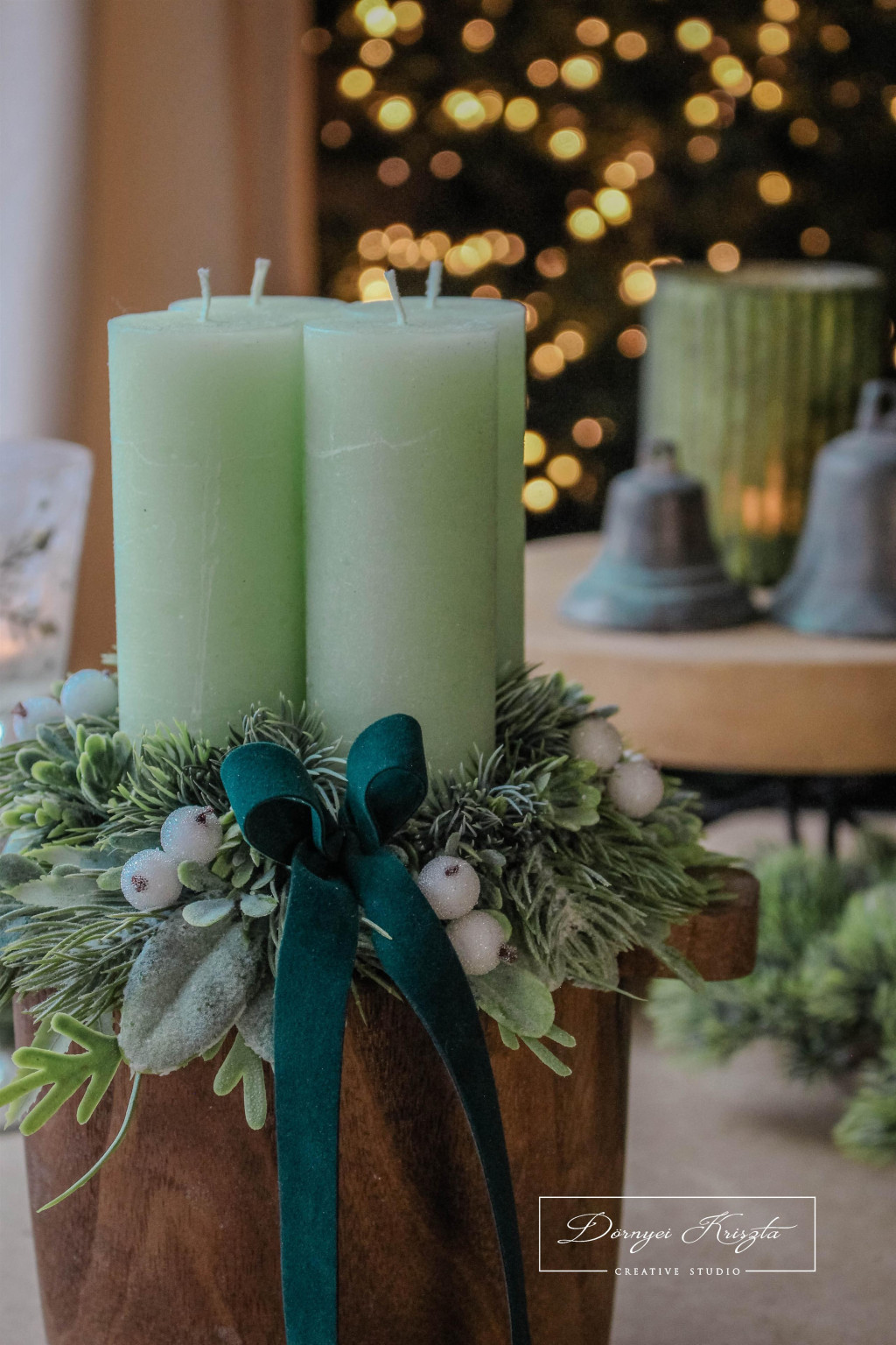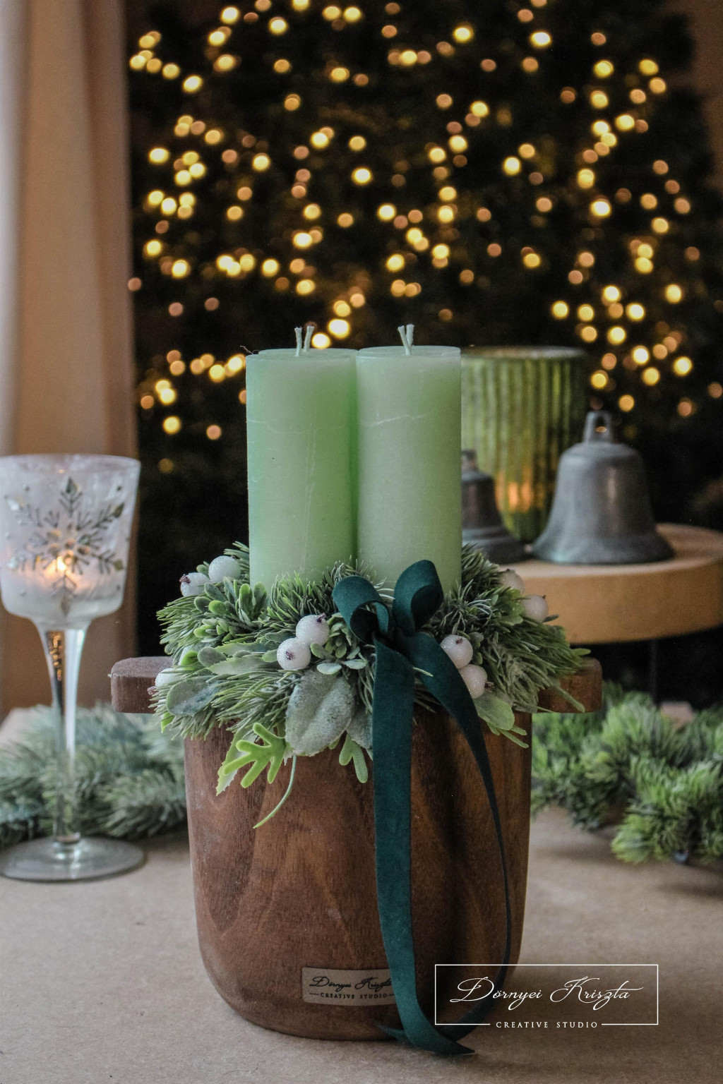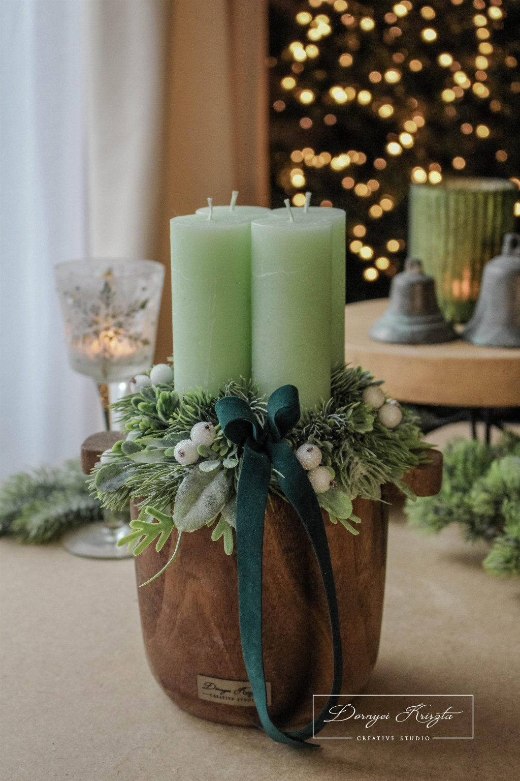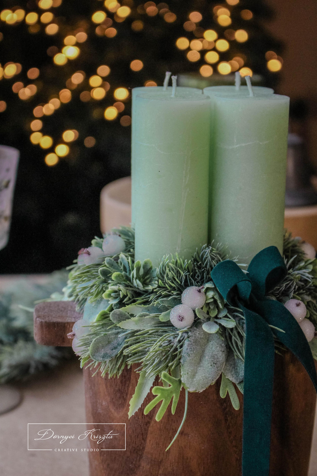 Általam lazúrozott, fa dézsa szerű alap, vintage zöld rusztikus gyertyákkal, prémium minőségű, élethű zöldekkel és kiegészítőkkel gazdagon díszítve. Sötétzöld bársony szalaggal.